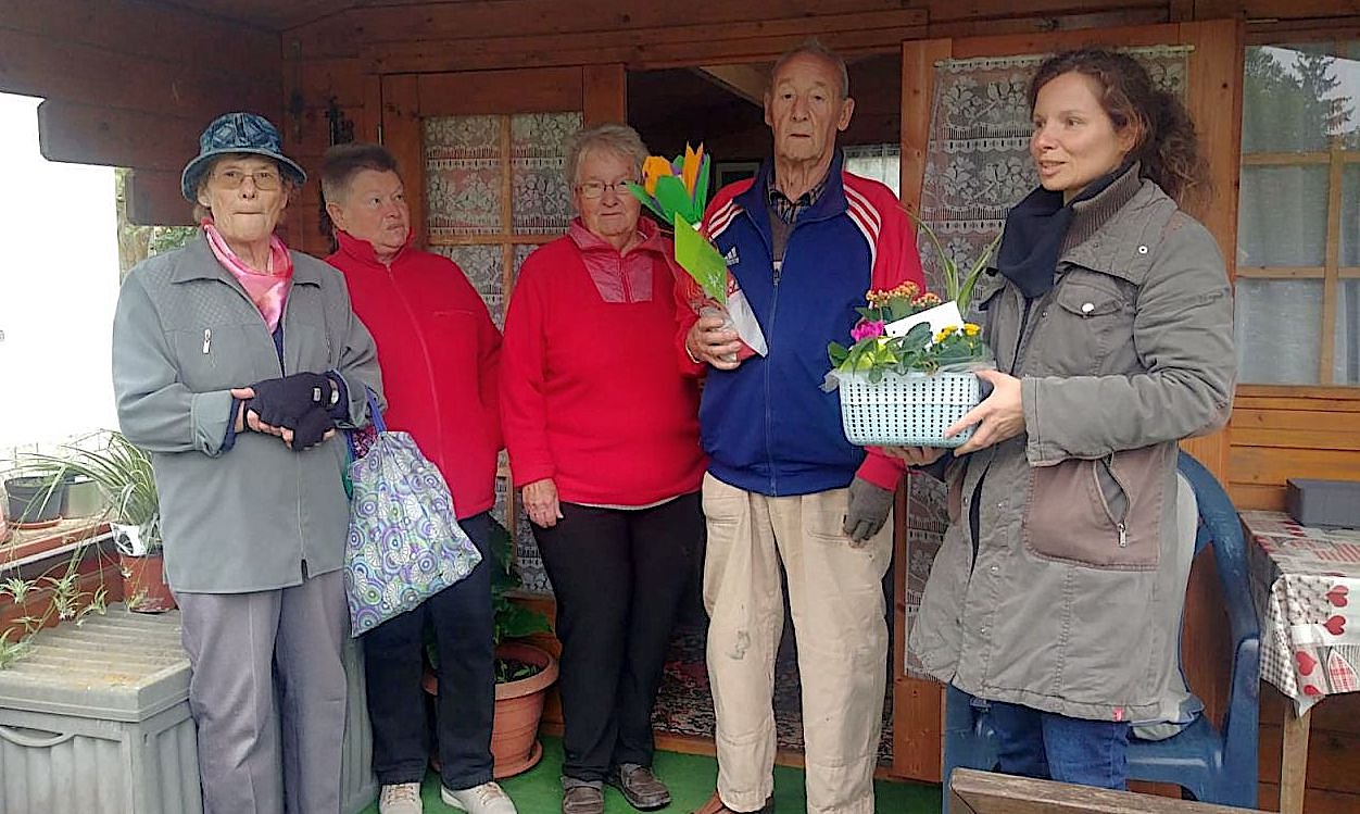 Heute war nun Gartenübergabe und Verabschiedung aus dem Verein. Vom Vereinsvorstand um die Vorsitzende Judith Blinzler gab es ein kleines Geburtstagsgeschenk für den 85jährigen Jubilar und zur Verabschiedung ein schönes Pflanzengesteck.