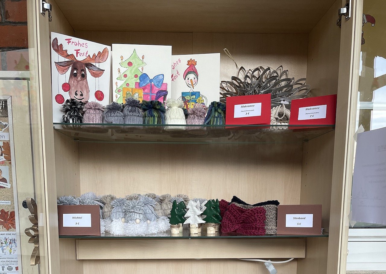 Das Vorhaben, selbstgebastelte Basteleien auf dem Oldislebener Weihnachtsmarkt anzubieten, konnte leider nicht verwirklicht werden. Aus diesem Grund kam kurzum die Idee auf, in der Kita eine Vitrine aufzustellen, um dort weihnachtliche Bastelarbeiten anbieten zu können. Erfolgt ist dies ganz kontaktlos mittels einer Kasse des Vertrauens.