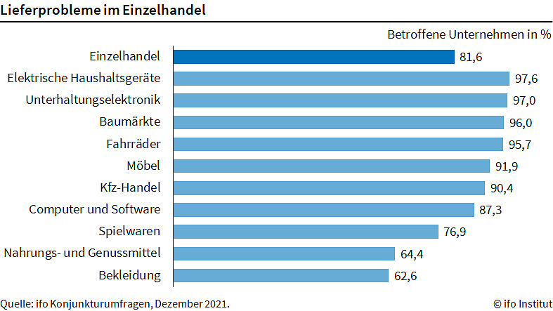 Die Lieferprobleme im Einzelhandel haben sich nochmals deutlich verschärft. 81,6 Prozent der Einzelhändler klagten im Dezember, dass nicht alle bestellten Waren geliefert werden können. Im November waren es noch 77,8 Prozent...