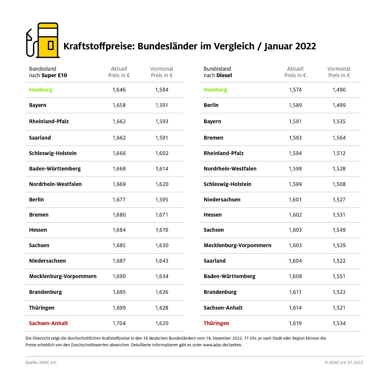 Wie die heutige ADAC Auswertung der Kraftstoffpreise in den 16 Bundesländern zeigt, kostet ein Liter Super E10 in Sachsen-Anhalt zurzeit im Schnitt 1,704 Euro. In Thüringen kostet E10 mit 1,699 Euro je Liter nur 0,5 Cent weniger.