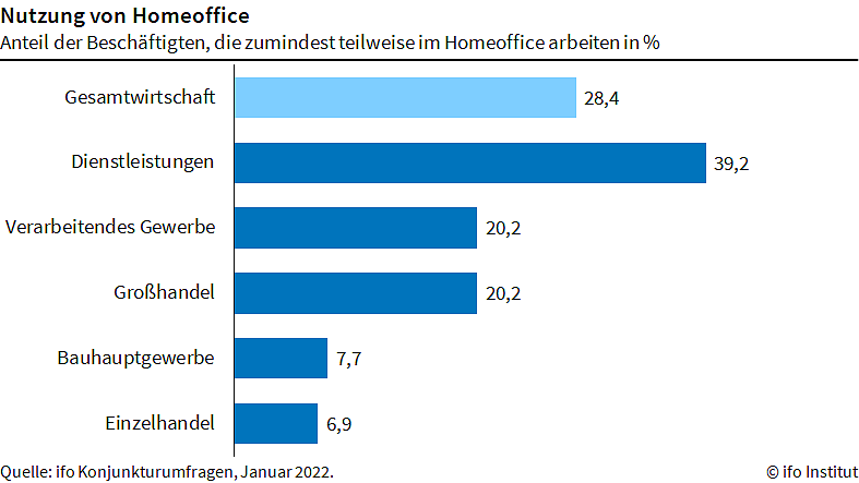 Bei den Dienstleistern stieg der Anteil von 38,2 auf 39,2 Prozent, in der Industrie von 19,7 auf 20,2 Prozent und im Einzelhandel von 6,6 auf 6,9 Prozent. Auf dem Bau fiel der Anteil von 8,5 auf 7,7 Prozent und im Großhandel von 20,8 auf 20,2 Prozent. Bei den Rundfunkveranstaltern und in der Telekommunikation fiel die Quote deutlich: Dort waren 46,8 bzw. 53,6 Prozent der Mitarbeitenden von zuhause für ihren Arbeitgeber tätig. Wieder mehr Beschäftigte arbeiteten in der Chemiebranche zuhause. Der Anteil stieg auf 21,7 Prozent, nach 16,6 im Dezember.