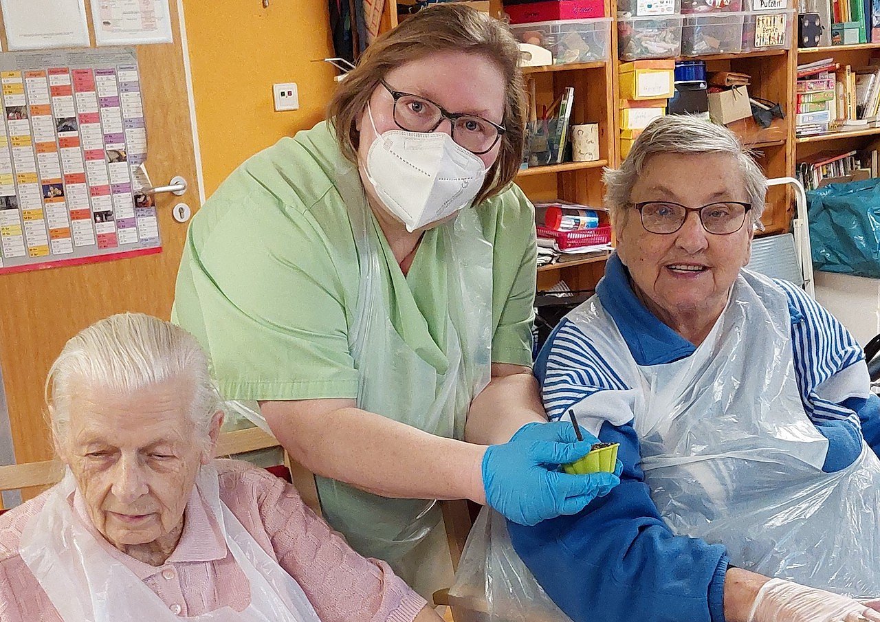 Damals ging es darum, wer die größte Sonnenblume aus eigenem Anbau hatte. Sieger waren wir geworden, denn unsere Sonnenblume hatte eine Größe von 3,60 Meter erreicht. Der Preis war ein Spannferkelessen für alle Bewohner und Mitarbeiter meiner Einrichtung. Wir haben uns alle über den Sieg gefreut, so Frau Mattauch die Regionalleiterin. Da ja die Nachhaltigkeit in der heutigen Zeit immer wichtiger wird, wollten wir auch hier nicht nur davon reden, sondern es auch umsetzen.