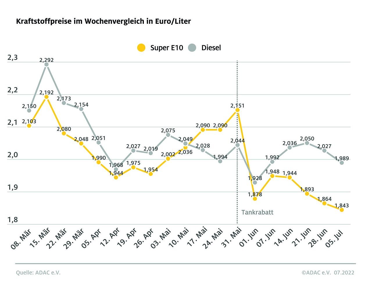 Für einen Liter Diesel muss man derzeit laut aktueller ADAC Auswertung im bundesweiten Schnitt 1,989 Euro bezahlen und damit 3,8 Cent weniger als in der Vorwoche. Der Preis für einen Liter Super E10 ist um 2,1 Cent gesunken und liegt jetzt bei 1,843 Euro.