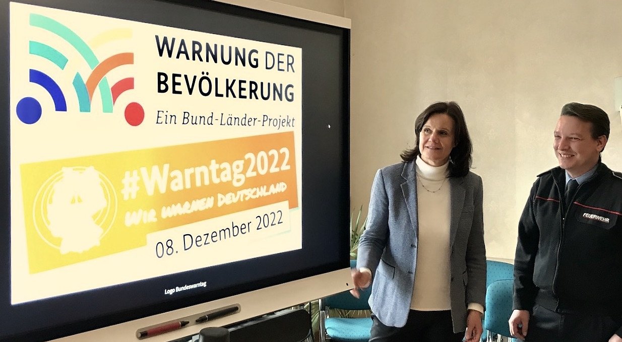 v.l. Landrätin Antje Hochwind-Schneider und Kreisbrandinspektor Jonas Weller informieren über den Bundesweiten Warntag 2022 (Foto: Eva Maria Wiegand)