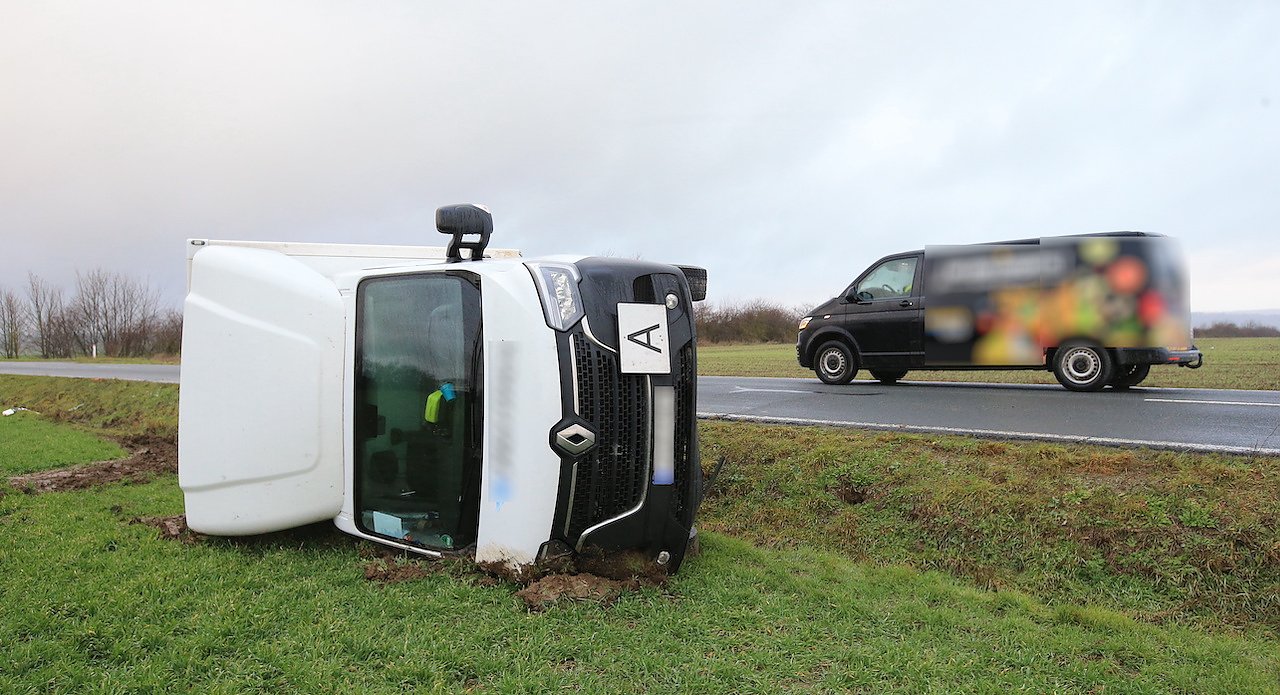 Der 36-jährige Fahrer eines Paketzulieferers befuhr die Landstraße von Holzthaleben kommend in Richtung Großbrüchter, als er bemerkte, dass ein im Gegenverkehr befindliches Fahrzeug auf seine Fahrspur abkam. Um einen Frontalzusammenstoß zu verhindern wich der Transporterfahrer nach rechts in den Straßengraben aus. Dabei kippte der Transporter auf die Beifahrerseite. Der Beifahrer des Fahrzeuges blieb unverletzt, der Fahrer kam mit leichten Beinverletzungen in das KMG Klinikum Sondershausen.