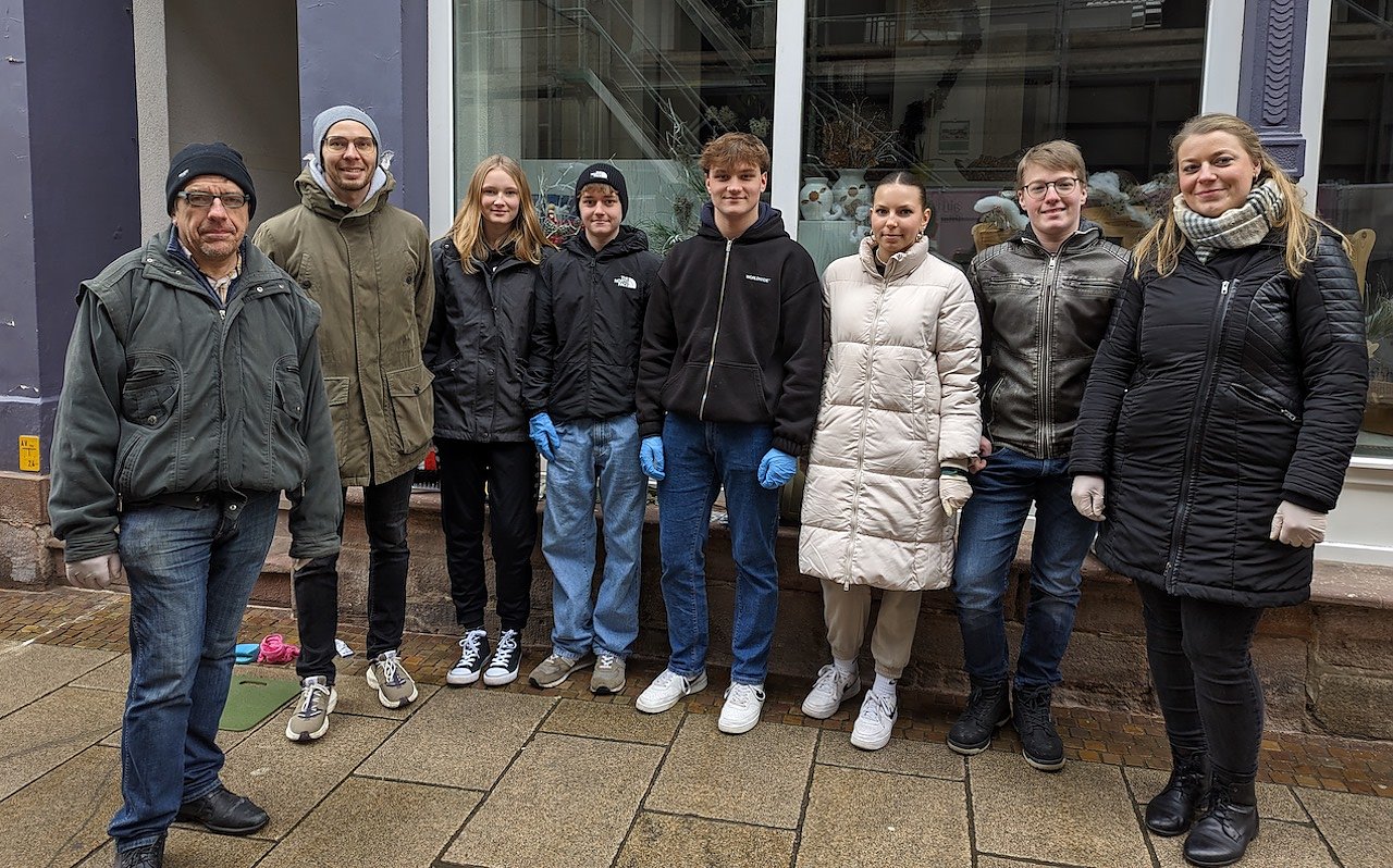 Schlossmuseumsleiterin Dr. Carolin Schäfer (rechts), Rüdiger Brüggemann, Geschichtslehrer Martin Brauer und Schülerinnen und Schüler des Geschwister-Scholl Gymnasiums trafen sich am Internationalen Tag des Gedenkens an die Opfer des Holocaust in der Innenstadt von Sondershausen, um gemeinsam die Stolpersteine zu putzen. (Foto: Janine Skara)
