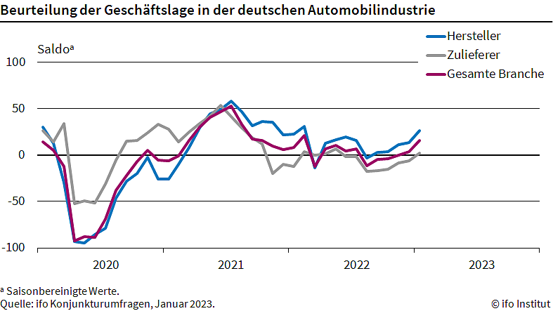 Die Geschäftslage der deutschen Autohersteller und ihrer Zulieferer hat sich im Januar deutlich verbessert. Das geht aus der ifo Umfrage hervor. Im Januar stieg der Indikator auf plus 14,1 Punkte, nach plus 3,4 im Dezember...
