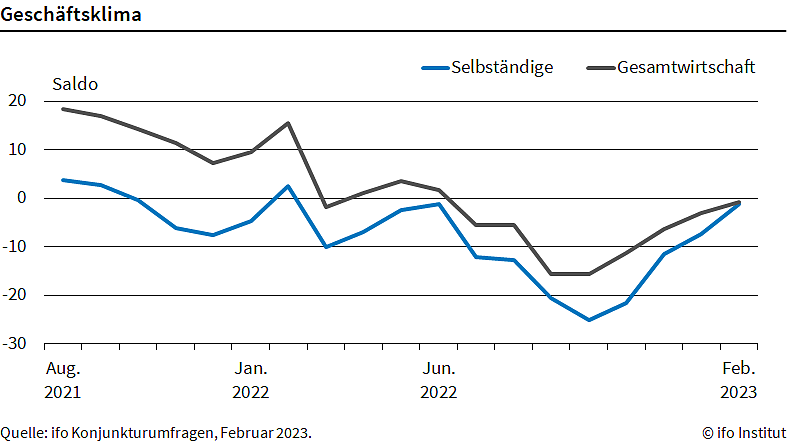 Das Geschäftsklima für Selbständige hat sich merklich verbessert. Das sind die Ergebnisse des aktuellen Indexes für dieses Segment (Jimdo-ifo-Geschäftsklimaindex für Selbständige). Er stieg im Februar auf minus 1,1 Punkte, nach minus 7,3 im Januar...