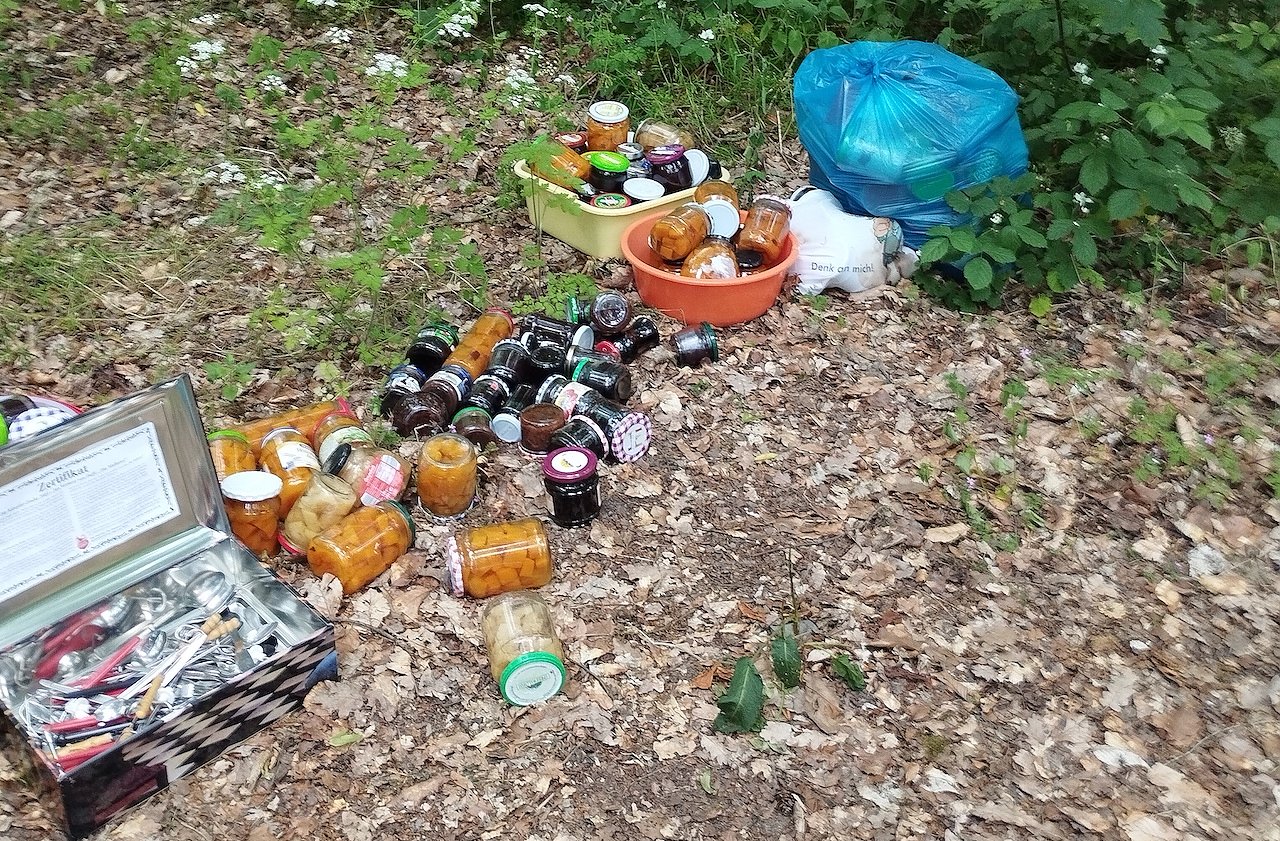 Im Wald die Panzerstraße entlang, auf der linken Seite, liegt wieder einmal Müll. Ob es sich um Diebesgut handelt oder jemand aus reiner Bequemlichkeit seinen Dreck in die Natur entsorgt hat, man weiß es nicht.