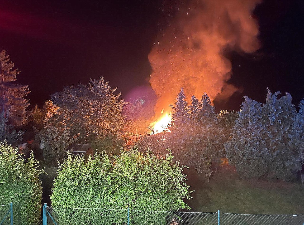 Schon auf der Anfahrt konnten die Einsatzkräfte das Feuer sehen. Vor Ort bestätigte sich die Lage, eine Gartenlaube stand bereits im Vollbrand.