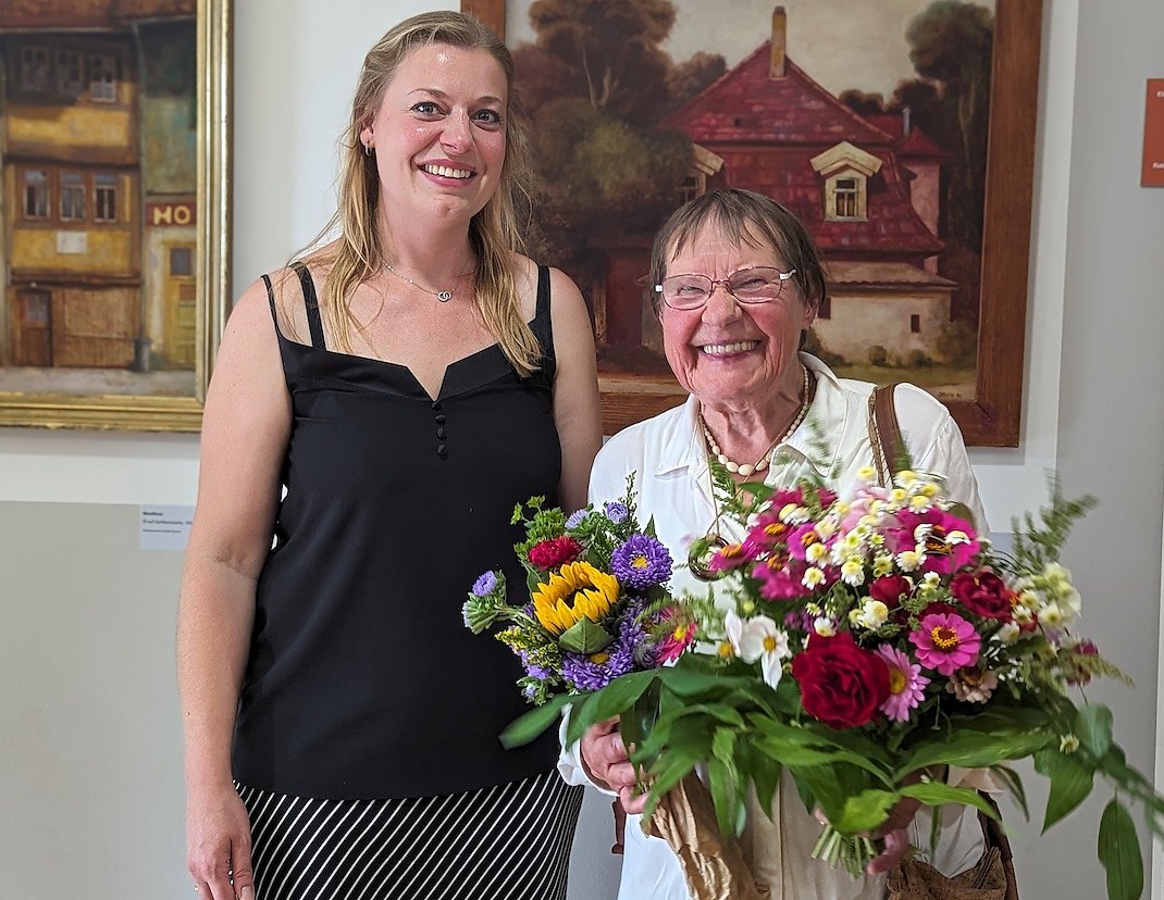 Dr. Carolin Schäfer (li), Leiterin des Schlossmuseums, würdigte die Sonderausstellung auch Gudrun Jahn (re.), der Witwe des verstorbenen Malers Günter Jahn (Foto: Janine Skara)