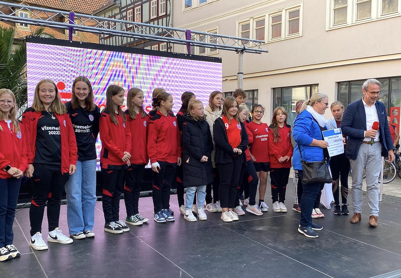 Auch der Thüringer Innenminister war aus Erfurt nach Bad Langensalza geeilt und kam, wie er es selbst ausdrückte nicht mit leeren Händen. Georg Maier überreichte dem Verein einen symbolischen Scheck über 3.000 Euro nebst Fördermittelbescheid, der zur Anschaffung neuer Bekleidung für die Nachwuchsmannschaften verwendet wird.