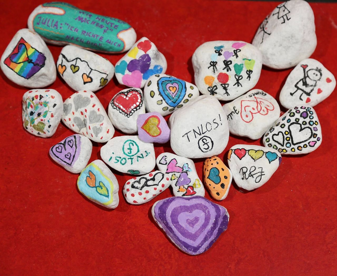 Von den sogenannten Wandersteinen, die bunt bemalt in den Wäldern und andernorts auftauchen, inspiriert, haben wir eine Romeo & Julia-Steine-Aktion ins Leben gerufen. Wer Spaß am Malen hat, oder auch nur am Suchen und Finden, ist eingeladen, Steine zu bemalen und auszulegen, gefundene Romeo & Julia-Steine mitzunehmen oder sie erneut auszuwildern, um einem weiteren Menschen eine Freude zu bereiten. Wer einen Stein findet, kann den Stein an der Fundstelle fotografieren und das Bild in der Facebookgruppe »Romeo & Julia-Steine TN LOS!« einstellen. So erfährt man, wo er aufgetaucht ist und die Künstlerinnen und Künstler freuen sich.