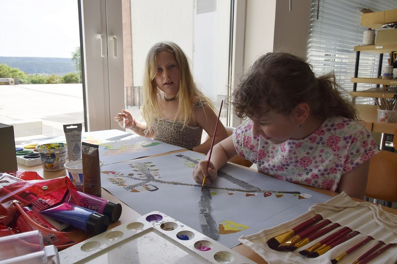 Nach verschiedenen Malversuchen, die von der Punktemalerei bis zum fantasievollen Gestalten von Skulpturen reichten, werkeln die Kinder nun an komplexeren Mischtechniken aus Zeichnung und Malerei. Sie sind dabei, ganz persönliche Wünsche in ihren Bildern darzustellen.