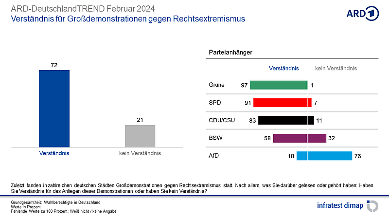 Etwa drei Viertel der Bundesbürger äußern Verständnis für das Anliegen der Aktionen und werten es zugleich als gutes Zeichen, dass so viele gegen Rechtsextremismus auf die Straßen gehen. Dass die jetzigen Demonstrationen längerfristig Bestand haben werden, bezweifelt allerdings die Hälfte der Bundesbürger. Zugleich ist fast jeder Zweite der Ansicht, dass die Demonstrationen von den eigentlichen Problemen im Land ablenken würden.