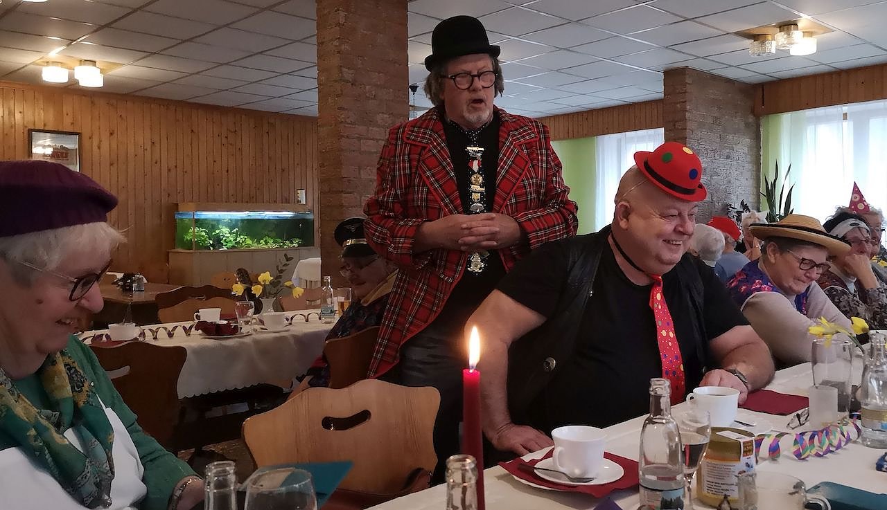 WB 4 Helau, so schallte es in der Seniorengruppe vom Wohnbezirk IV (WB 4) der Volkssolidarität in Sondershausen zu ihrer Faschingssitzung im Handwerkerstübchen. Herr Haubner und das Team hatte die Tafeln schön mit Girlanden, Kerzen geschmückt und bereits zum Kaffeegedeck eingedeckt...
