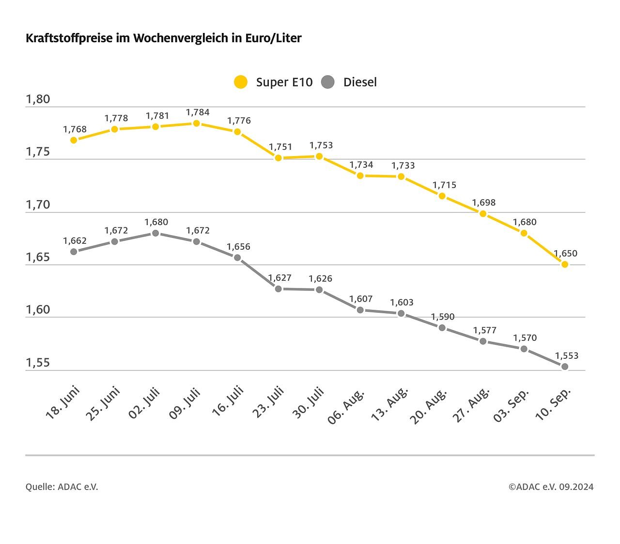 Danach kostet ein Liter Super E10 im bundesweiten Mittel 1,650 Euro und damit drei Cent weniger als in der Vorwoche. Diesel ist um 1,7 Cent je Liter billiger und kostet aktuell im Schnitt 1,553 Euro.