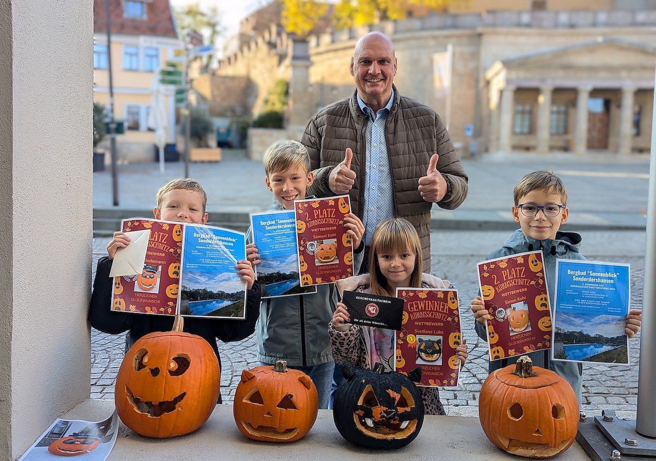 Bürgermeister Steffen Grimm (Mitte) mit den glücklichen Gewinnern des diesjährigen Kürbisschnitzwettbewerbes (v.l.n.r.): Emil Bodemann (2. Platz), Samuel Koch (2. Platz), Gewinnerin Svetlana Luks und Simon Kohl (2. Platz). Carl Bodemann gewann den 3. Platz. (Foto: Janine Skara)