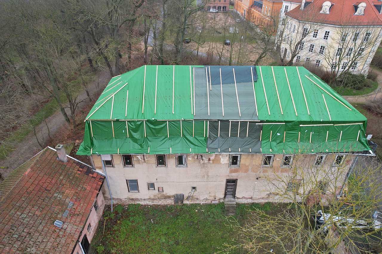 Auf Schloss Sondershausen hat die Stiftung Thüringer Schlösser und Gärten das Dach des Jägerhauses mit einem Notdach aus Spezialfolien versehen. Die Planen sollen das Gebäude bis Baubeginn vor eindringender Feuchtigkeit schützen, da die vorhandene Wellbitumeneindeckung das Ende ihrer Haltbarkeit erreicht hat...