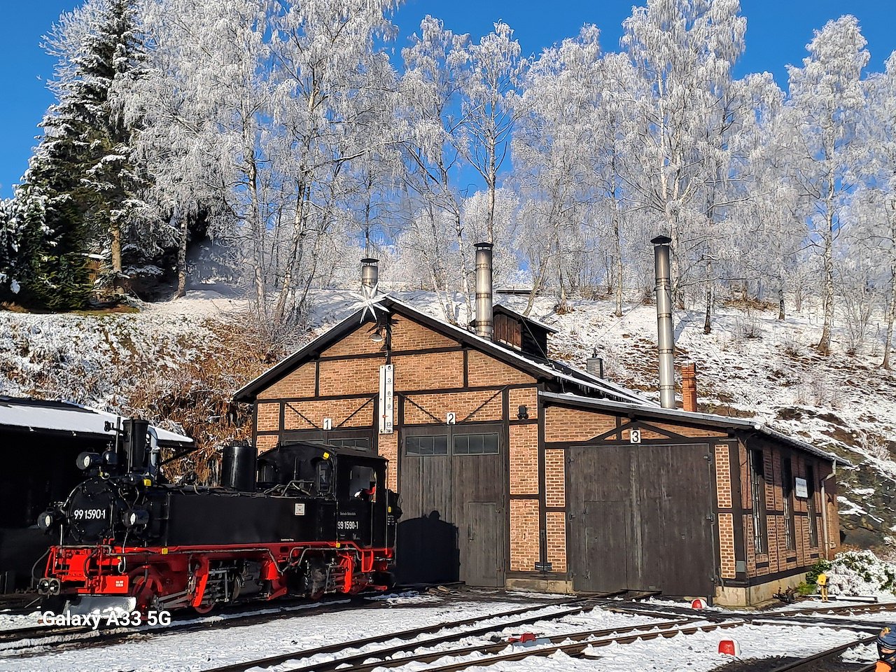 Folgender Text erreichte uns: Am letzten Wochenende waren wir im Erzgebirge. Dabei entstand das Foto bei herrlichem Winterwetter. Pressnitztalbahn Heizhaus in Jöhstadt 99 1590 am 14.Dezember. L. Alert