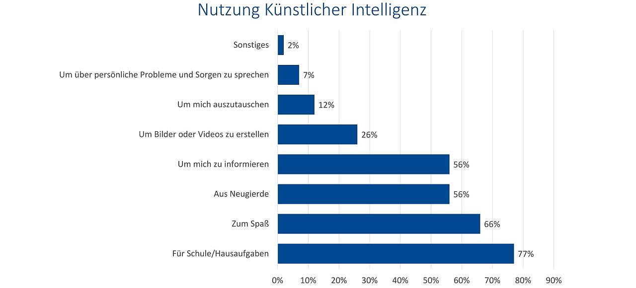 Ebenso haben die Forschenden festgestellt, dass KI bereits fest im Alltag von Kindern und Jugendlichen verankert ist. Am häufigsten wird KI zur Unterstützung beim Lernen im Bereich der Schule und bei den Hausaufgaben (77 Prozent) genutzt. Kinder und Jugendliche sehen KI aber nicht nur als Arbeitsmittel, sondern auch als Spiel- und Kreativwerkzeug: Spaß (66 Prozent), Neugier (56 Prozent) und Erstellen von Bildern/Videos (26 Prozent).