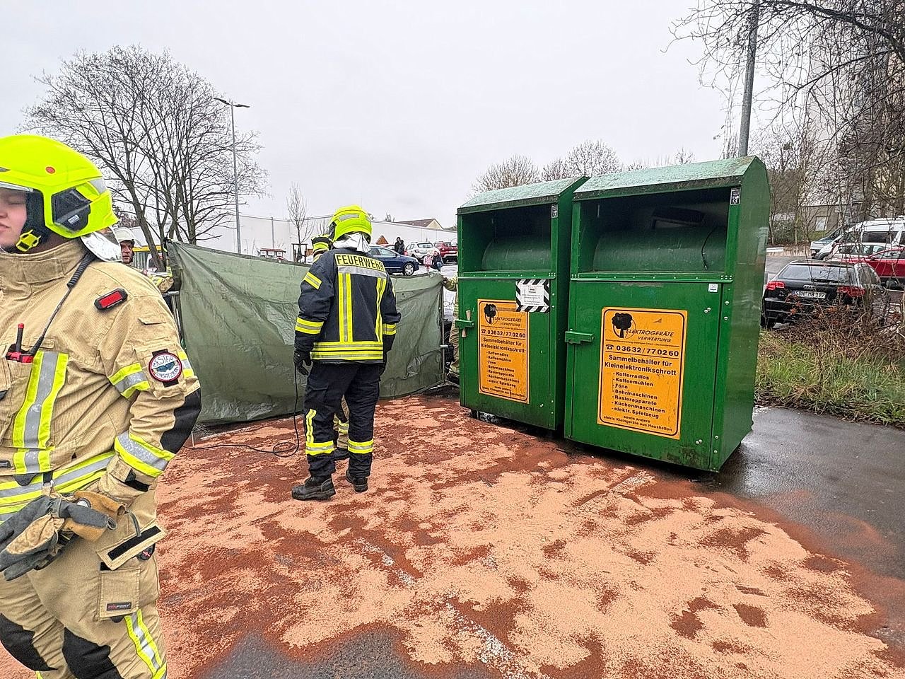 Dieser informierte die Nordhäuser Rettungsleitstelle, die im weiteren Verlauf die Sondershäuser Feuerwehr alarmierte. Da nicht ausgeschlossen werden konnte, dass es sich bei der ausgetretenen Flüssigkeit um einen Gefahrstoff handelte, wurde der stellvertretende Gefahrgut-Zugführer aus Clingen hinzugezogen. Recht schnell konnte die ausgetretene Flüssigkeit als ölige Substanz identifiziert werden. Nachdem der Schrottcontainer mittels einer Flex geöffnet wurde, konnte dann Entwarnung gegeben werden.