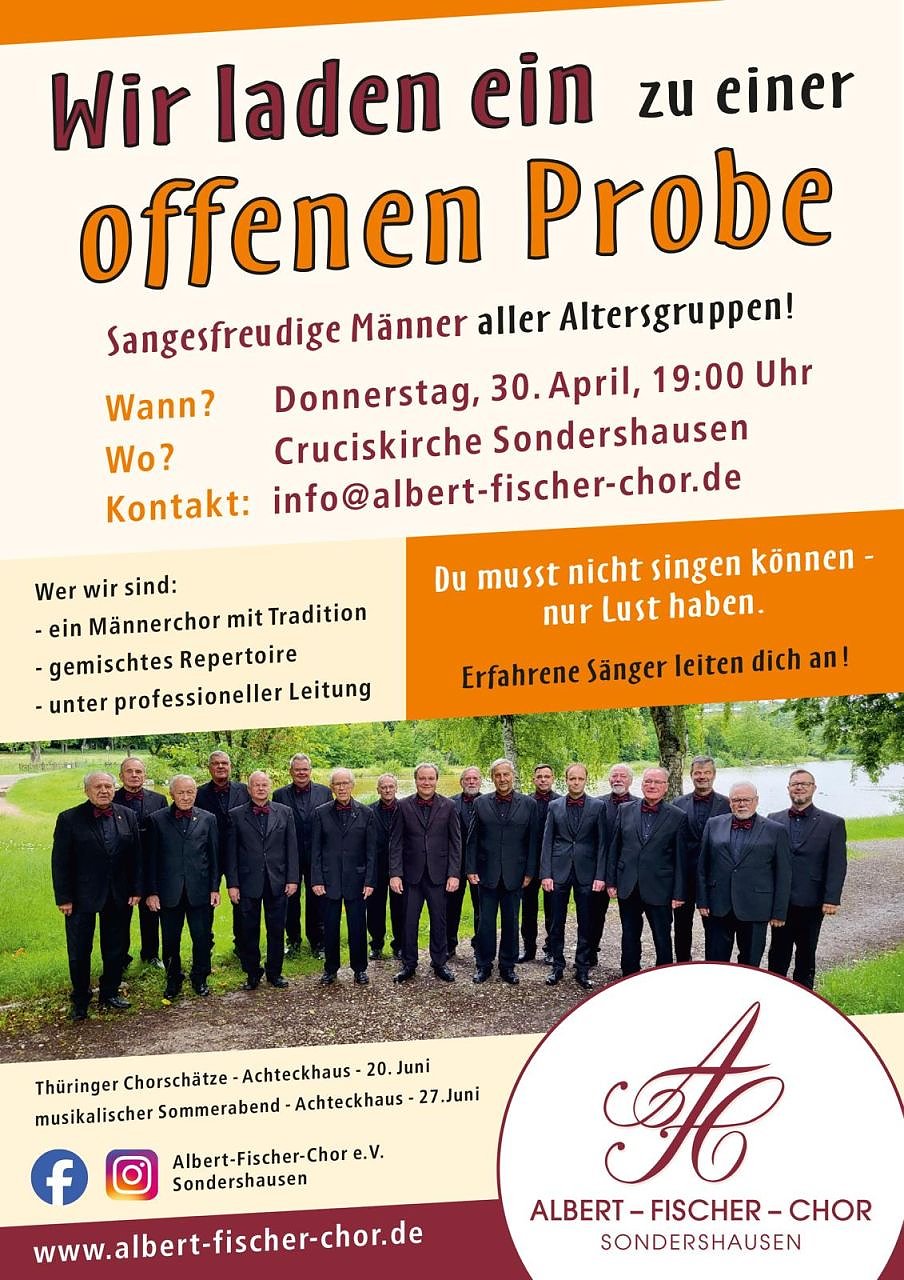 Der Albert-Fischer-Chor lädt zu einer offenen Probe ein und wirbt um neue Mitglieder. Die Veranstaltung findet am Donnerstag, 30. April, um 19 Uhr in der Cruciskirche in Sondershausen statt.