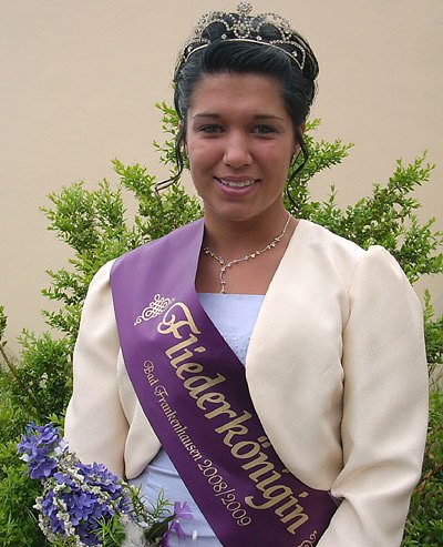 Bei vor die Fliederkönigin in ihr Fahrzeug stieg, gab es erst mal einen kleinen Fototermin, denn bei dem Trubel bei der Krönung war kaum ein ruhiges Foto zu machen. Deshalb hier die Fliederkönigin Heidi I. nochmals in aller Ruhe vorgestellt. Ihre Hoheit stammt aus Esperstedt, das ja jetzt auch ein Teil von Bad Frankenhausen ist. Im bürgerlichem Leben heißt sie Heidi Eckebrecht und ist Verwaltungsangestellte im Landratsamt Kyffhäuserkreis Sondershausen, arbeitet also stilgerecht im ehemaligen Prinzenpalais. Ihr Hobby ist der Sport, insbesondere das Reiten. Für ihre Bewerbung wurde sie von ihren Paten, der Kur GmbH (Kyffhäuser-Therme) und von Katrin Dietze, auch schon mal Fliederkönigin sehr gut vorbereitet.
