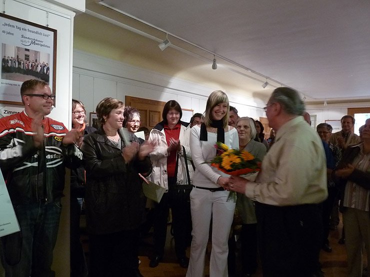 Die Sondershäuser Madrigalisten sind für ihren gekonnten und exzellenten Chorgesang weit über die Grenzen von Sondershausen und des Kyffhäuserkreises bekannt. Oft genug traten sie in den Nachbarkreisen, wie z.B. Nordhausen auf. Da wundert es nicht, dass heute im Foyer ein richtiges Gedränge herrscht, so groß war das Interesse am Ausstellungsbeginn.