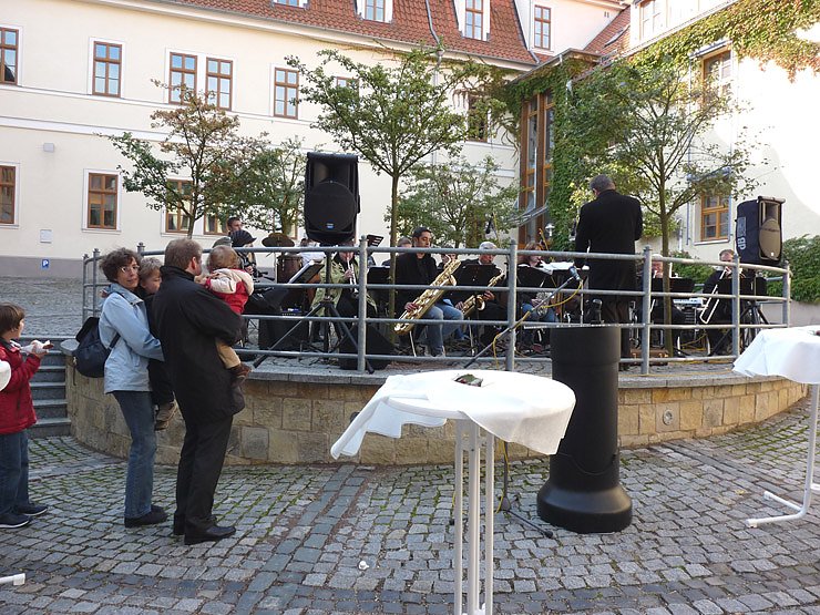 Im Innenhof des Landratsamtes sorgte die .Little Big Band für die nötige musikalische Stimmung. Und mit Bier, Glühwein und einem Klaren war auch für die notwendige innere Erwärmung gesorgt. Natürlich gab es auch Alkoholfreies und auch beim Rauchen galten heute nicht die scharfen Gesetze des Thüringer Rauchergesetztes, das bis auf eine Insel im Innenhof auch das Rauchen im gesamten Landratsamt verbietet. Selbst aus dem fernen Holzthaleben war Kreistagsmitglied Klaus-Dieter Grüneberg angereist, um die Besucher zu beköstigen. (links, in der Bildergalerie linkes Bild)