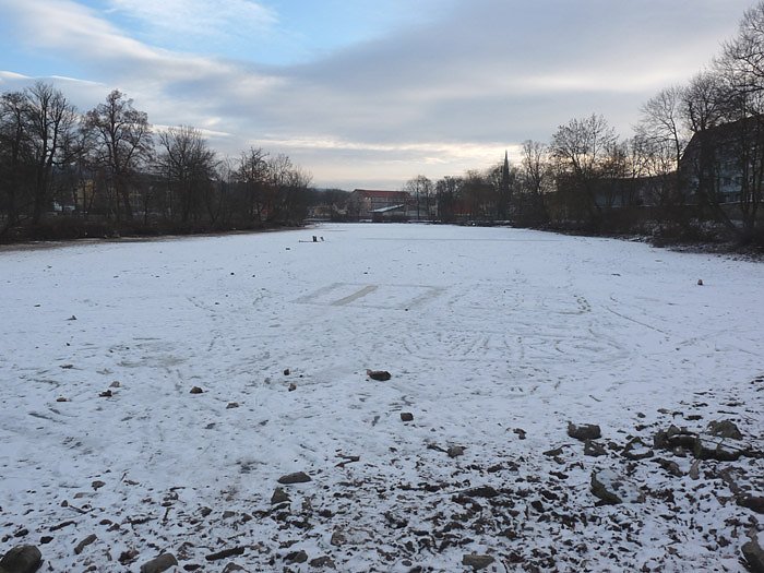 Aber auch an anderer Stelle hat man in Sondershausen glatt verpasst eine Spritzeisbahn zu bauen. Den Tipp eines Lesers hat sich kn vor Ort angeschaut. Der große Parkteich im Schlossgarten von Sondershausen ist wegen Sanierungsarbeiten weitgehend abgelassen (kleines Bild Pfeil). Durch Restwasser haben sich die Vertiefungen, wie unteres Foto zeigt, ausgeglichen und eine recht ebene Fläche geschaffen. Auch hier hat man schon versucht, wie das Bild zeigt, auf dem Eis Sport zu treiben. Wäre ein Teil dieser Fläche gründlich gesäubert worden, hätte man mit Hilfe der Feuerwehr und etwas Wasser eine Spritzeisbahn bauen können, die auch noch nahe am Stadtzentrum liegt. Aber wie gesagt, man hätte, denn der Tipp, so gut er gemeint war, kam wohl etwas zu spät.