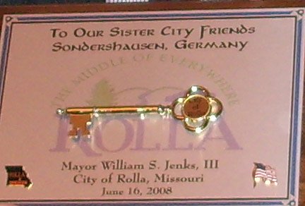 Die Fans, vor allem die weiblichen, hatten unser Team aus Sondershausen, das den Pokal gewann, ausgiebig angefeuert. Über diese und andere Erinnerungen aus Rolla hatten die Reisenden die Vereinsmitglieder auf der letzten Sitzung informiert. Als offizieller Gruß des Bürgermeisters Bill Jenks wurde symbolisch der goldene Schlüssel zur Partnerschaft (Foto) an den Bürgermeister Kreyer übergeben.Schon im Sommer 2008 äußerten die Veranstalter ihre Erwartung, das Sondershausen zur Verteidigung des Pokals 2009 natürlich wiederkommen sollte. Im Rahmen der Mitgliederversammlung des Vereins für internationale Städtepartnerschaft Sondershausen e. V. am 17.11.2008 wurde der Beschluss gefasst, am Thomas Whitefield-Memorial-Soccer-Tournament 2009 teilzunehmen. Der Vorstand wurde beauftragt, mit den Vorbereitungen der Reise eines sechsköpfigen Teams umgehend zu beginnen.