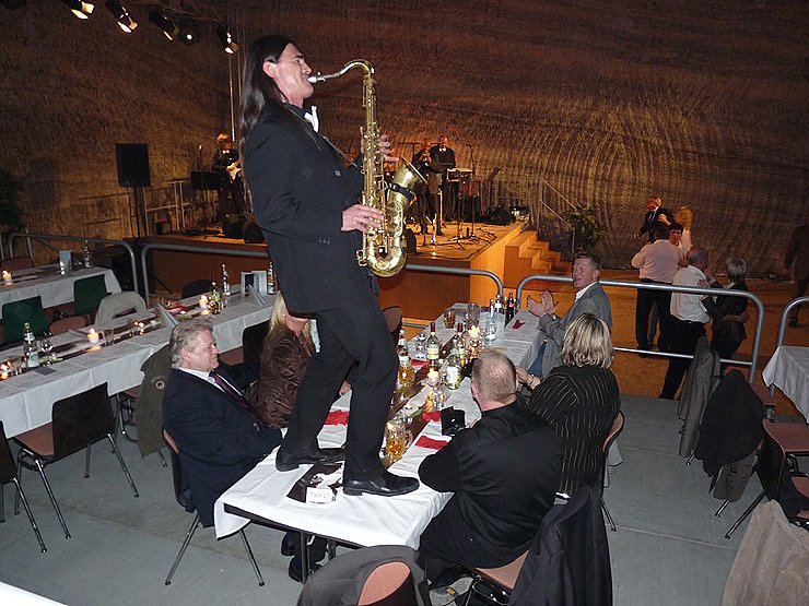 Ab 17.30 Uhr konnten die Gäste bereits in das Bergwerk einfahren, rund zwei Stunden später wurde der Ball eröffnet und kurz danach auch das Buffet mit vielen Köstlichkeiten. Zuvor gab es noch einige Überraschungen, oder hätten sie unter Tage ein Pferd vermutet, daß zusammen Bergmanns-Blasorchester in den Ballsaal marschierte? Wer wollte, der konnte auch mal schnell einen Abstecher zum untertägigen Salzsee machen, und sich dort mit dem Kahn fahren lassen.