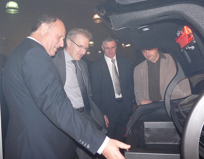 Sohn Andreas Peter (re.) stellte begeistert den neuen Elektroantrieb vor, der in einen A-Klasse Wagen eingebaut worden war. Der geistige Vater dieses Elektroantriebes, Stefan Rudolph, das bald in Kleinserie gebaut werden soll, schaut dabei immer noch fasziniert in das von ihm geschaffene Modell.