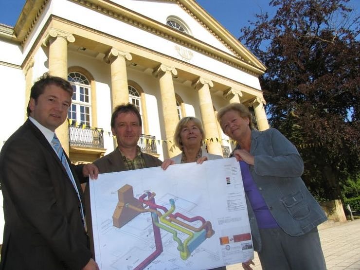 Intendant Tietje, Elko Vopel, Oberbürgermeisterin Barbara Rinke und Theater-Aufsichtsrätin Helga Rathnau (v.l.n.r.) mit einem Entwurf der neuen Lüftungsanlage für das Nordhäuser Theater