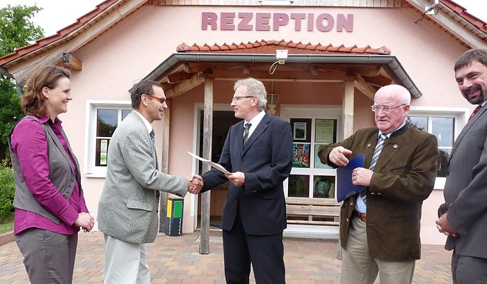 Geschäftsführerin des Ferienparks, Antje Hochwind, Vereinsvorsitzender des Ferienparkvereins Georg Schäfer, Minister Gerold Wucherpfennig, Landtagsmitglied, Günter Grüner und Sondershausens Bürgermeister Joachim Kreyer bei der Übergabe des Förderbescheids.