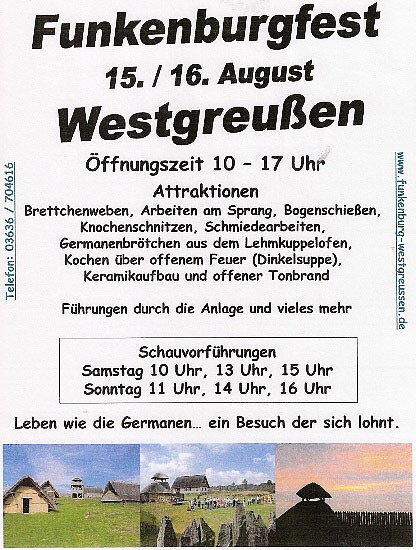 Dieses Wochenende findet wieder das beliebte Funkenburgfest in Westgreußen statt. Am Samstag und Sonntag geht es jeweils ab 10:00 Uhr los. Gefeiert wird jeweils bis 17:00 Uhr. Auf dem Plan stehen unter anderem Brettchenweben, Arbeiten am Sprang, Bogenschießen oder Kochen am offenen Feuer und vieles mehr.