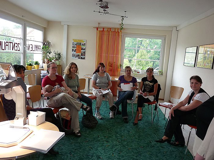 Die Teilnehmerinnen hatten genügend Zeit für Zwischenfragen, während der Nachwuchs eine Etage tiefer liebevoll betreut wurde. Wenn ein Baby schreit, so Sandra Goldschmidt in der Einleitung, wird es sofort hochgebracht, denn was liebt Baby? Richtig, vertraute Personen!