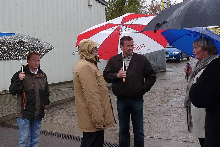 Das Wetter zum Rundgang durch den Ort war nicht gerade das beste. Während der Landrat auf Kapuze setzte, entschied sich der Bürgermeister rechts daneben für den Regenschirm.