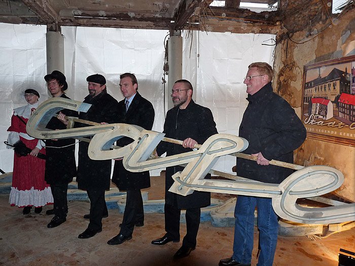 Claudia Baltruschat, Nico Störzing, Joachim Kreyer, Mike Schielke, Ralf Huke und Matthias Werner tragen die noch vorhandene ehemalige Leuchtreklame.