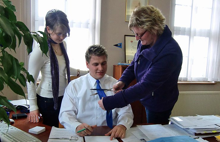 Schnell war man fündig geworden. Wo? Natürlich beim Chef selbst. Es kann doch wohl nicht angehen das Bürgermeister Matthias Strejc an so einem Tag mit Schlips regiert, dachten sich die beide Politessen bei der Kontrolle. Und Schwups wurde Hand angelegt an das gute Stück des Bürgermeisters.