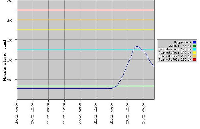 Hier ist heute die Meldegrenze überschritten worden, so dass sich der Pegel schon den Hochwassermarken nähert.