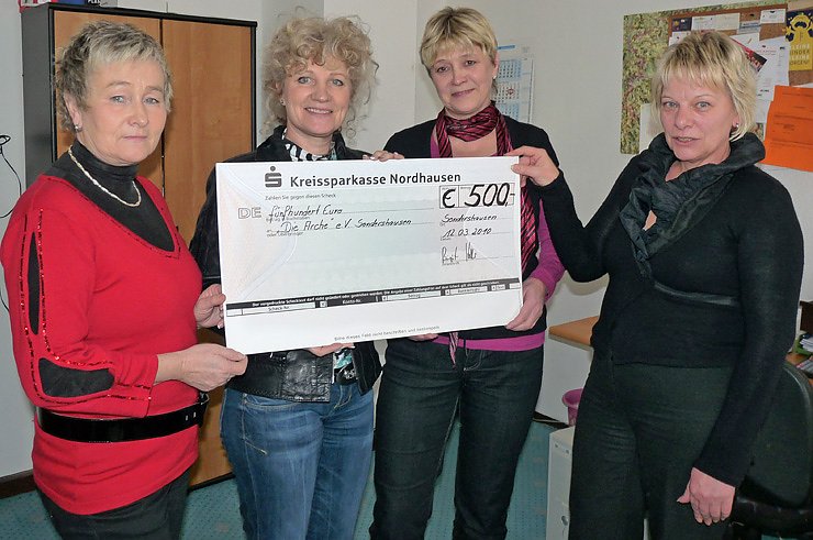 Bei der Scheckübergabe dabei (von links nach rechts): Jutta Lehrling, Birgit Keller, Ludmilla Krause und Veronika Hesse. Nicht mit auf Bild wollte Kreistagsmitglied Beatrice Ritzke (Die Linke), die sich als Kamerafrau betätigte.
