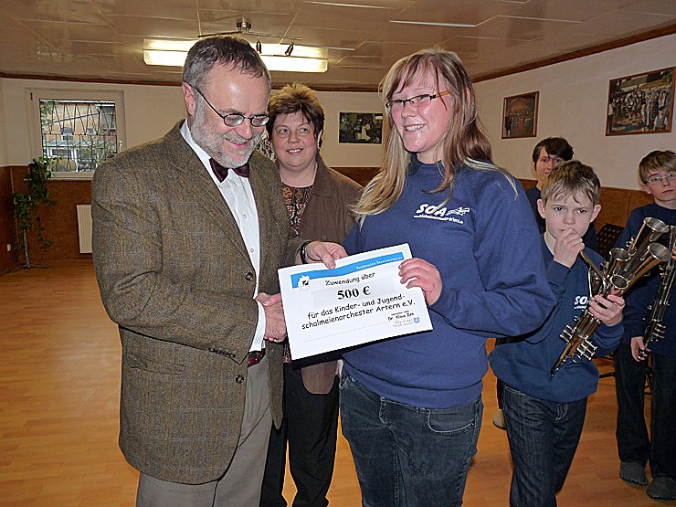 So bat als der Verein des Kinder- und Jugendschalmeienorchester Artern Landtagsmitglied Gudrun Holbe (CDU) sich mal in Erfurt bei der Landesregierung für den Verein "stark zu machen". Heute nachmittag war es so weit, der Landrat des Kyffhäuserkreises Peter Hengstermann (CDU)übergab im Auftrag der Thüringer Ministerpräsidentin Christine Lieberknecht (CDU)einen Bewilligungsbescheid über Lottomittel an das Kinder- und Jugendschalmeienorchester Artern.