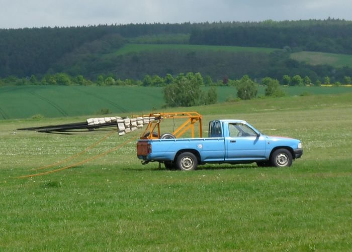 Da musste man schon mal warten, ehe man so einen Rundflug von 10 bis 20 Minuten mit dem Segelflugzeug bekam. Die Segelflugzeuge wurden mit der Seilwinde hochgezogen. Nach dem zweiten Start musste erst mal das oben abgebildete Fahrzeug ran, dass die beiden Seilenden wieder zum Startpunkt brachte.