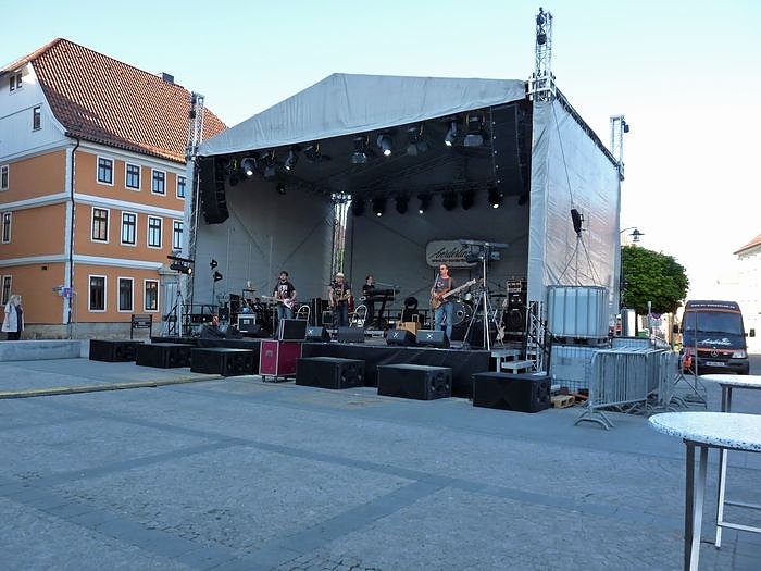 Und in der Tat, die Bühne hat dieses Jahr einen anderen Standtort erhalten. Hintergrund dafür war, dass es in den vergangenen Jahren doch immer wieder Beschwerden gab, besonders aus dem Wippertor, der Lärmpegel sei zu hoch. Dieses Jahr zielten die Lautsprecher doch mehr Richtung Schloss und ein Fürst war derzeit nicht zu Hause.