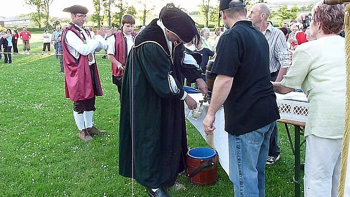 Traditionalgemäß hatte Bad Frankenhausen Bürgermeister ein Fässchen Bier für die Uderleber Burschenschaft spendiert. Auch Laubkönig Mario I. mit seinen bezaubernden Hofdamen Jenny I und Tina II bekam ein Bierchen spendiert.