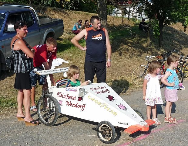 Am weitesten kam Martin Plaga mit seiner Seifenkiste. Beim nächsten Mal fahre ich nicht mehr so weit. Die Seifenkisten rollten zwar allein den Berg Richtung Rottleben runter, da aber die weiteste Fahrt von zwei Rennen gewertet wurde, musste man die Kiste auch wieder an den Start zurückschieben. Bei rund 30 °C im Schatten und das bergauf eine schweißtreibende Angelegenheit.