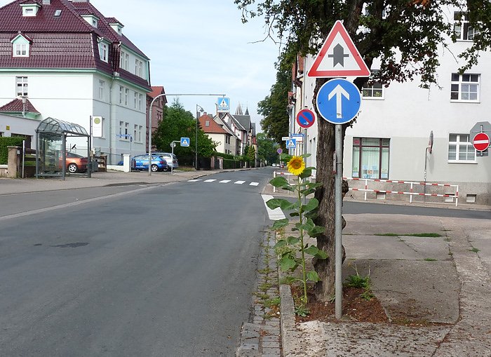 Hat hat schon Seltenheitswert, wenn mitten in der Stadt Sondershausen in der starkfrequentierten Gartenstraße eine Blume am Wegesrand überlebt. Das diese Sonnenblume bisher trotz Trockenheit und viel Stein überlebt hat ist schon Wunder an sich. Das die Blume auch noch steht und nicht gepflückt wurde ist schon ein großes Wunder. Aufmerksame Leser von kn hatten extra kn darauf hingewiesen.