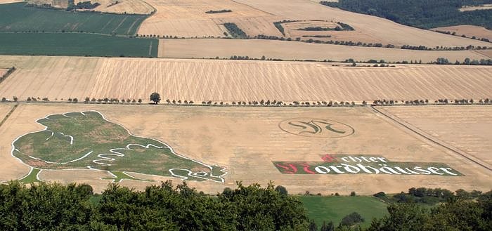 War es am Anfang ein braunes Huhn auf grünem Untergrund, so hat sich das Bild jetzt gewandelt: Das umgebende Roggen feld ist nun kurz vor der Ernte goldgelb, während sich Henriette in saftigem Grün mit einigen Farbtupfern präsentiert. Das alles sollte man sich unbedingt noch einmal anschauen, bevor es Ende August vorbei ist. Dann nämlich wird Bauer Jürgen Niederhäuser seinen Acker neu bestellen und die Nordbrand-Henriette wird vom Pflug wegrasiert.